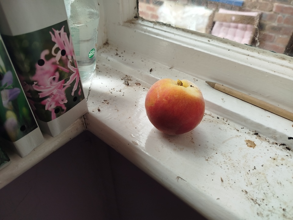 Joshua and I planted two peach trees as well as two vines and two pomegranates in the upper part of the vegetable garden, the area once known as the jungle. One vine and one pomegranate survive but both peaches are flourishing and this was the first fruit. Joshua , the Mrs and I shared it and it was amazing. The boy has the second for his school snack today and there will be more at the weekend. You don’t expect such fruit in North East Wales so I regard this as a bit of a triumph