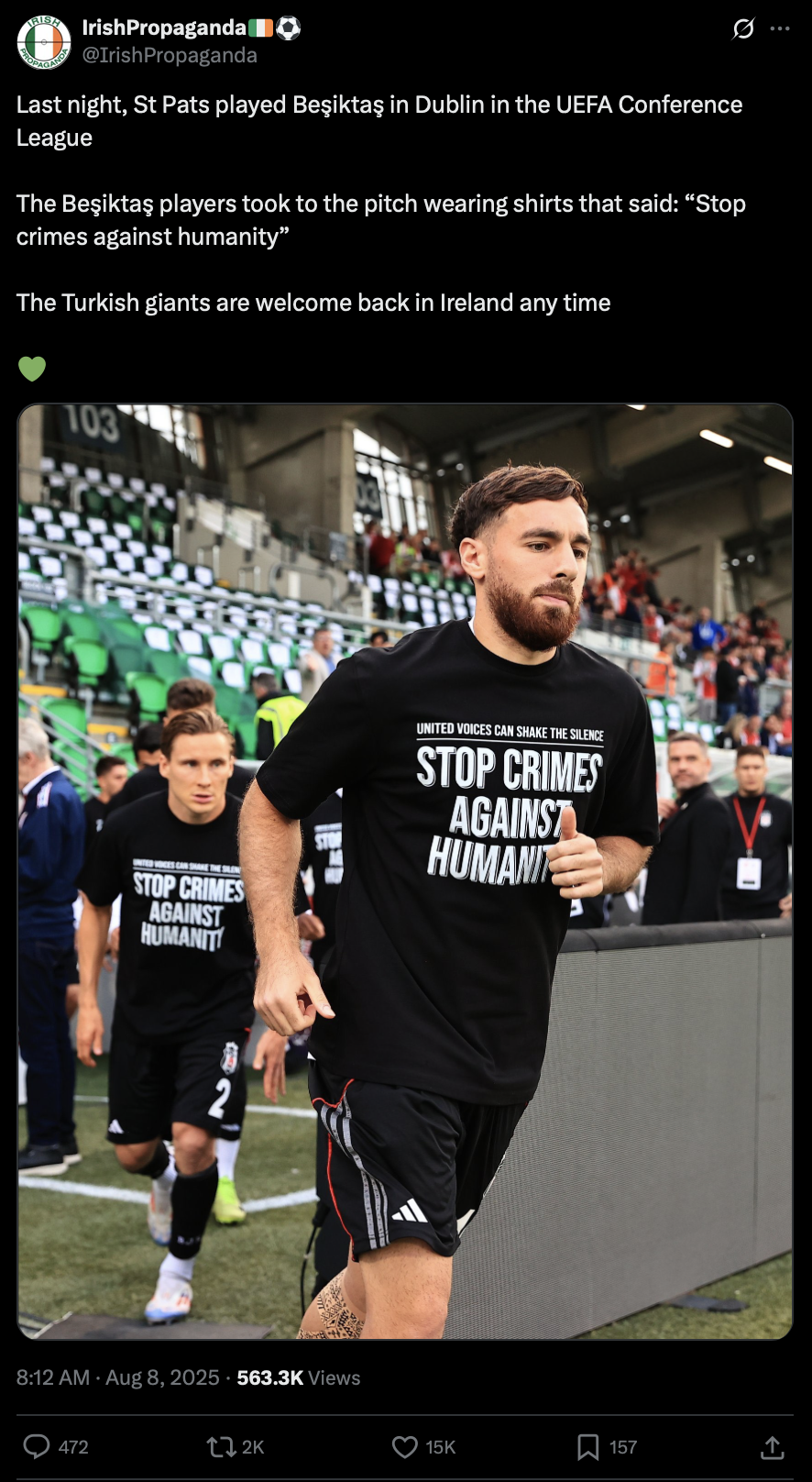 Some Turkish soccer players had a match in Dublin and took to the pich wearing shirts that said “stop crimes against humanity” a reference to Gaza. In Europe’s most rancid anti semitic sewer that played well.