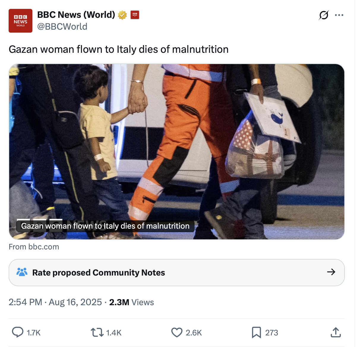 The screenshot below is of a tweet now viewed more than 2.3 million times claiming that Israel, the wicked Jews, had caused another poor Gazan to die from hunger. It has been shared across the world.
