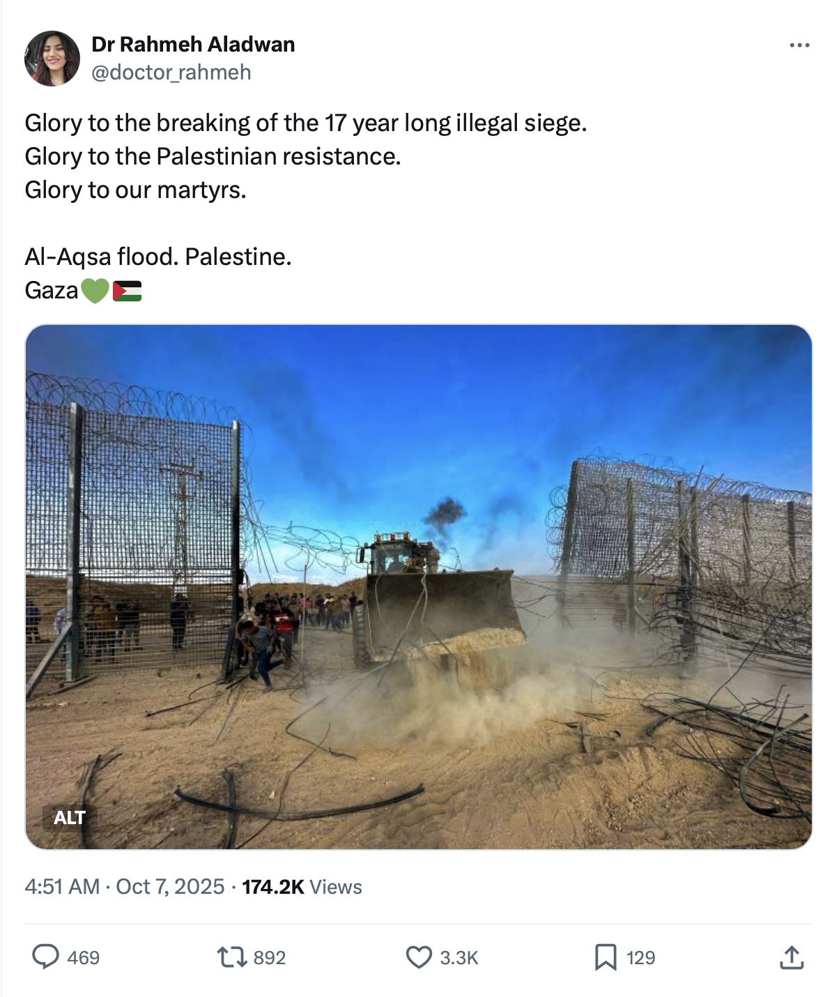 Dr Rahmeh Aladwan has a long history of tweeting antisemitic abuse. Yesterday, as you can see below, she tweeted a celebration of the biggest one day slaughter of Jews since WW2, of rape, of babies burned alive or strangled to death.