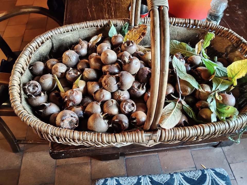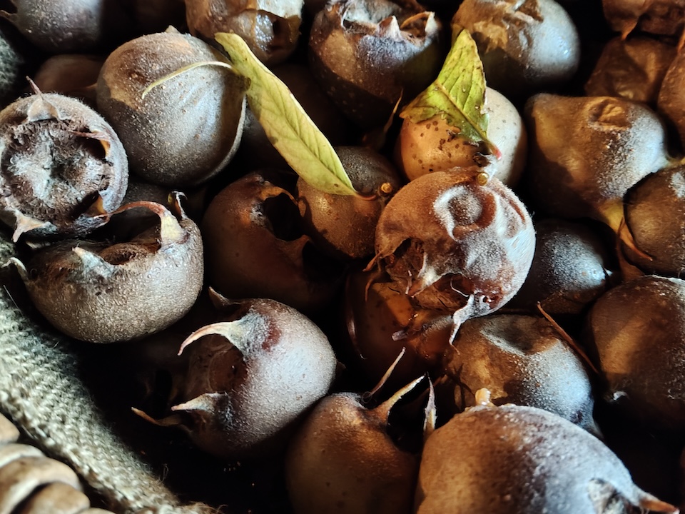 The thing about dogs arse fruit, Nottingham Medlars in polite society, is that you need to wait until they are bletted ( that is to say gone beyond ripe towards rotten) before you pick them. Explaining that to my assistant, son and heir Joshua, made it hard to convince him to taste one.